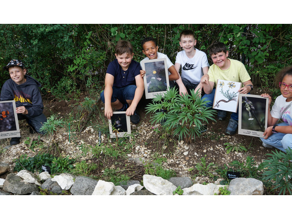 Zusammen mit älteren Schülern haben wir schöne Schiefer-Tafeln mit dem Trivialnamen und dem botanischen Namen beschriftet und in die Erde gesteckt. So weiß der Betrachter, was hier – eventuell (noch) unscheinbares – wächst und niemand trampelt aus Versehen darauf. Unsere Lehrerin hat fortlaufend schöne Makroaufnahmen von unseren großen und kleinen Erfolgen gemacht. Zum Tag der offenen Tür hat sie uns mit großen Abzügen und drei wunderschönen A4-Zeichnungen von einer Achtklässlerin überrascht. Diese Bilder haben wir auf den Nachher-Fotos hochgehoben, denn nicht alle Pflanzen blühen jetzt Ende Juli (noch) oder sind bei einer Aufnahme von weiter weg gut zu sehen.