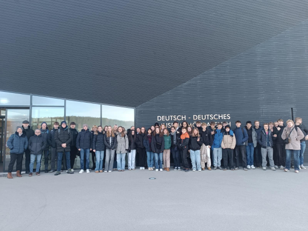 Da die Finnen bereits einige Tage vor den Franzosen vor Ort waren, konnten sie am Freitag dank einer Kooperation mit dem Paul-Pfinzing-Gymnasium Hersbruck an einer Veranstaltung des Vereins „Weiße Rose Stiftung”, der demokratisches Bewusstsein fördern möchte, teilnehmen. Eine Stadtbesichtigung von München rundete den Tag ab. Nach einem Wochenende in den Familien besuchten wir, nun auch im Beisein der französischen Gäste, Nürnberg, wobei uns hier die Jahreszeit in die Karten spielte: der Christkindlesmarkt und die mittelalterliche Burg begeisterten die Gäste. Ein starker Kontrastpunkt dazu war der Besuch im Memorium, das die glanzlose, düstere Vergangenheit Deutschlands aufarbeitet und erfahrbar macht. Erfreulich war, dass sich Jugendliche aus diesen drei Ländern achtzig Jahre später friedlich und aufgeschlossen an diesem historischen Ort der konfliktreichen, gemeinsamen Geschichte widmeten. Am Dienstag unternahmen wir eine kleine Zeitreise und fanden uns mitten im kalten Krieg wieder, genauer gesagt an einem Ort, in dem die Zeit stillzustehen scheint. In Mödlareuth beschäftigten wir uns mit einem Spezifikum, nämlich der jahrzehntelangen Teilung Deutschlands. Dieses Kapitel der deutschen Geschichte wird im Ausland nicht tiefergehend behandelt, weshalb der Vortrag mit größtem Interesse von unseren Gästen verfolgt wurde. Bei der Erkundung des Geländes, welches von der erbarmungslosen Umsetzung der räumlichen Trennung der zwei deutschen Staaten geprägt ist, gab es einiges zu entdecken.